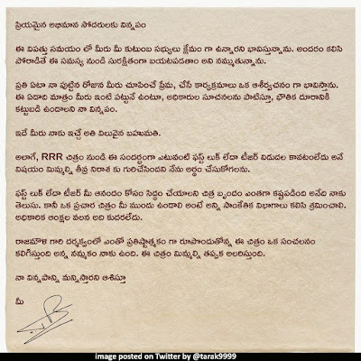 అలాగే ఆర్ ఆర్ ఆర్ సినిమా నుండి ఎలాంటి టీజర్ లేదా ఫస్ట్ లుక్ విడుదల కావటం లేదు, టీజర్ లేదా ఫస్ట్ లుక్ సిద్దం చేయాలని చిత్రబృందం కష్టపడింది, కానీ లాక్ డౌన్ కారణంగా ఇది సాధ్యపడలేదు. ఈ విషయం మిమ్మల్ని తీవ్ర నిరాశకు గురిచేస్తుందని నేను అర్ధం చేసుకోగలనని Jr. NTR అన్నారు.